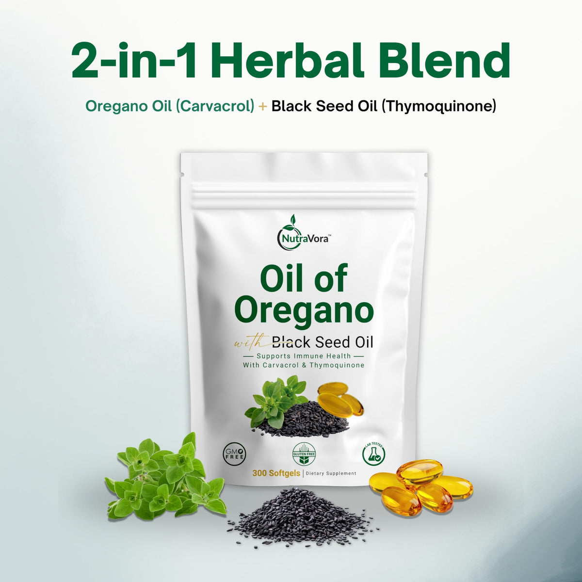 NutraVora Oil of Oregano with Black Seed Oil Capsules – Dietary Supplement for Immune & Respiratory Wellness Support – with Carvacrol & Thymoquinone – Non-GMO, Gluten-Free – 300 Softgels